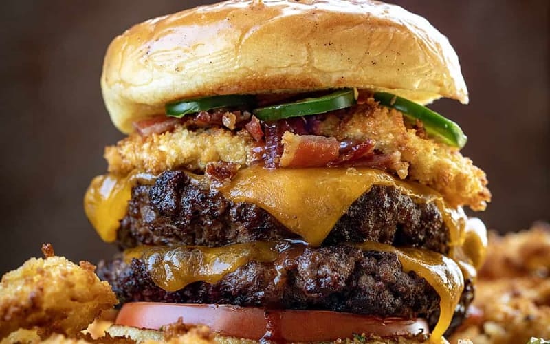 Pravý mužský burger Rodeo so šťavnatým hovädzím plátkom, chrumkavou slaninou, čedarom, nakladanými uhorkami, čerstvým šalátom a originálnou omáčkou. Podáva sa