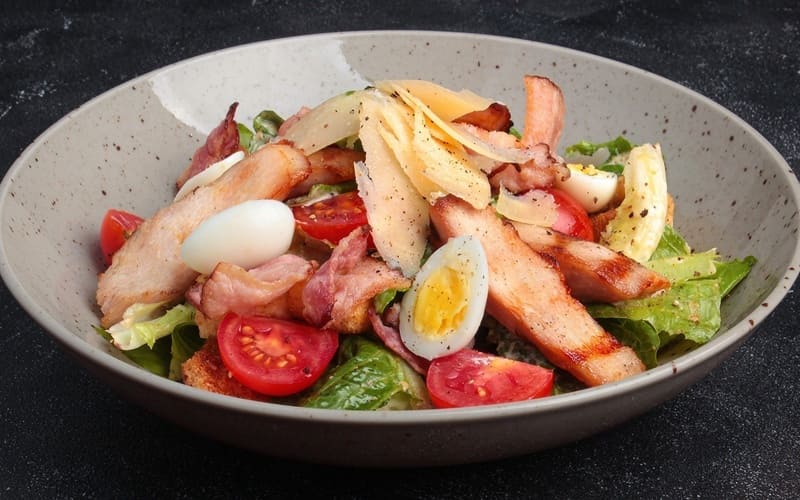 Ľahký a zároveň výživný šalát Caesar s jemným grilovaným kuracím mäsom, chrumkavými listami ľadového šalátu, aromatickými krutónmi, parmezánom a klasickým