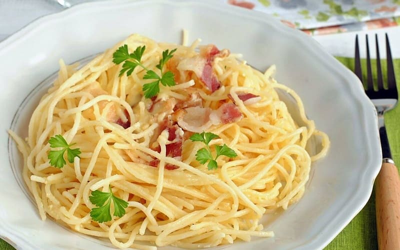 Krémové cestoviny Carbonara podľa klasického talianskeho receptu: špagety, osmažená pancetta alebo slanina, žĺtok, parmezán a čierne korenie. Jedná sa o