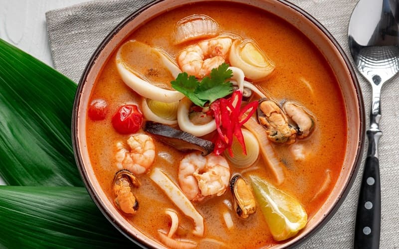 Pikantná a aromatická polievka Tom Yum s kráľovskými krevetami, hubami, paradajkami a exotickými bylinkami. Toto jedlo vás vďaka svojej živej